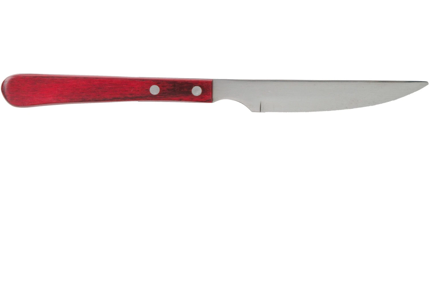 Mit einem guten Messer schmeckt das Steak einfach noch besser! Das traditionelle Design der Brasero Steakmesser von Amefa mit seinem rotbraunen Griff aus Pakkaholz macht auf jedem Tisch eine gute Figur. Die Klinge ist aus hochwertigem 13/0 Messerstahl gefertigt, der Holzgriff ist mit zwei Nieten versehen. Die Klinge hat einen feinen Wellenschliff, sodass sie mühelos durch jedes Fleisch schneidet.