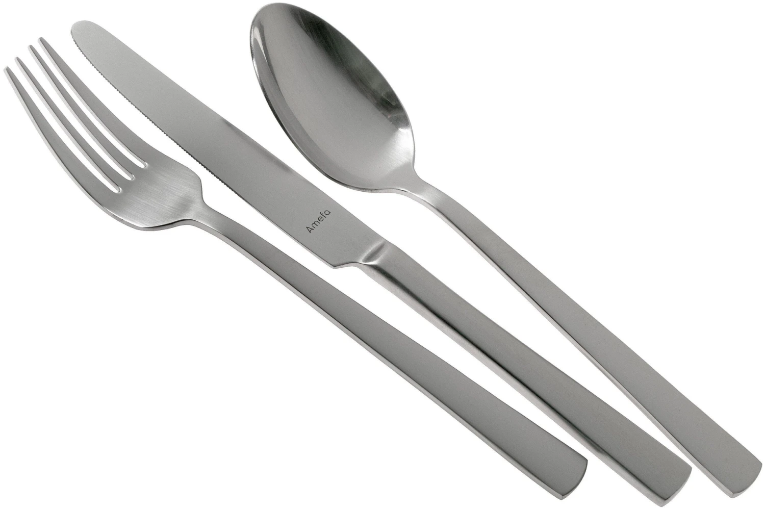 Amefa Ventura ist ein starkes, zeitloses und elegantes Modell und darf bei einer modernen Tischdeko einfach nicht fehlen. Das Besteck hat ein mattes Finish. Die Produkte bestehen aus Chrom-Nickel-Stahl, besser bekannt als rostfreier 18/10 Stahl. Dadurch ist diese Serie sehr korrosionsbeständig. Die Produkte dieser Serie sind spülmaschinenfest.