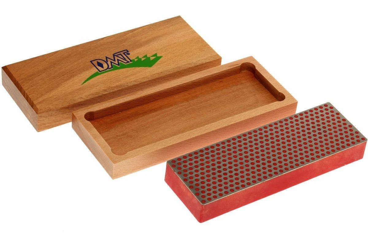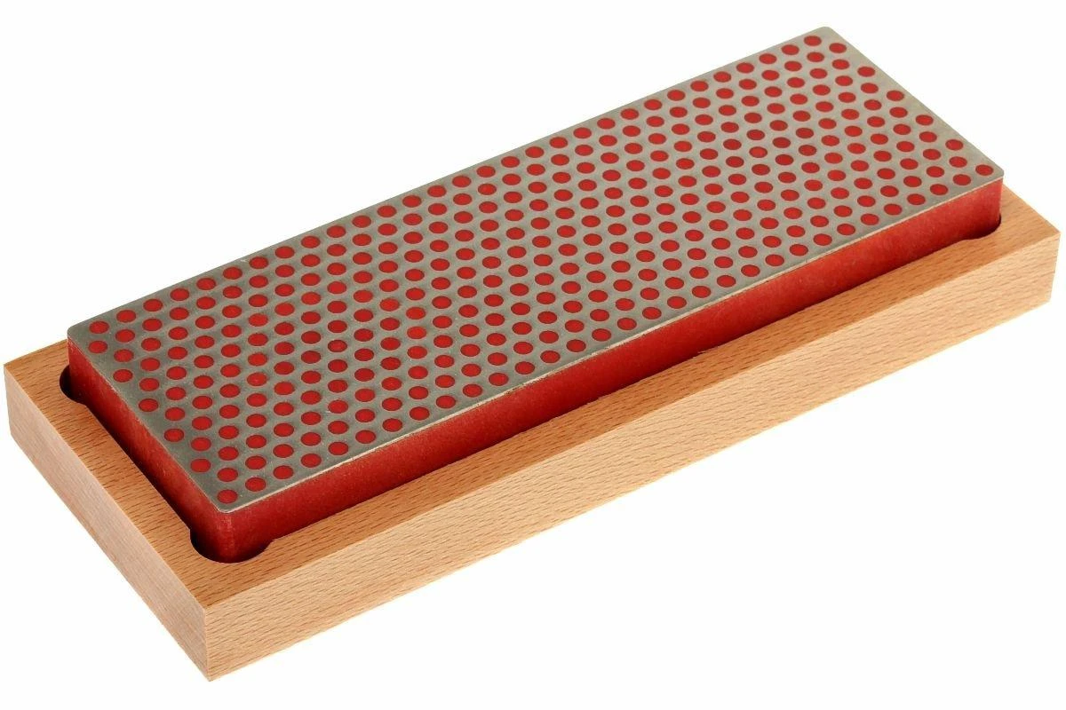 Schleifstein mit Diamant-Schleiffläche mit dem vertrauten Kreis-Muster. Der Stein hat eine feine Maserung. Dieser Schleifstein wird in einer Hartholz-Box mit rutschfesten Füßen geliefert.