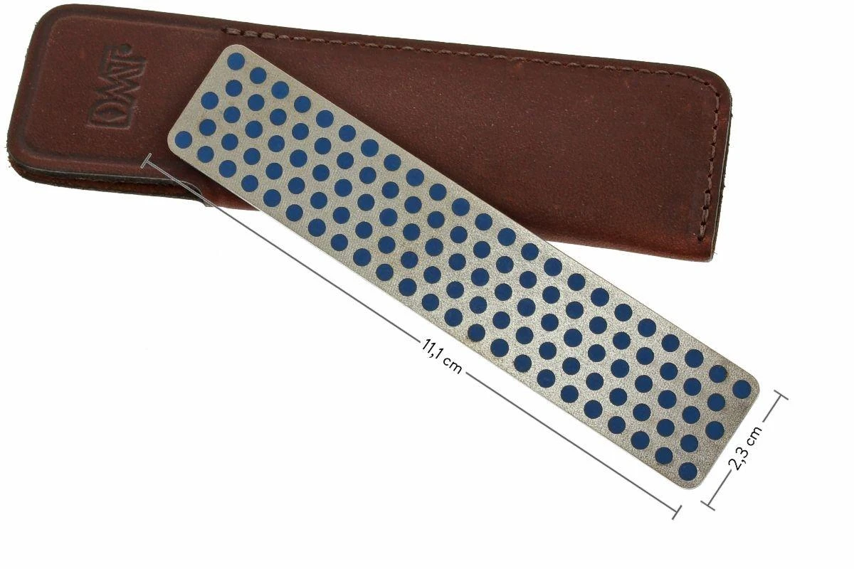 Schleifstein mit Diamant-Schleiffläche mit dem vertrauten Kreis-Muster. Der Stein hat eine grobe Körnung. Dieser Schleifstein wird in einem Etui aus echtem Leder geliefert. Aufgrund der geringen Abmessungen ist dieser Schleifstein perfekt, um unterwegs zu benutzen.