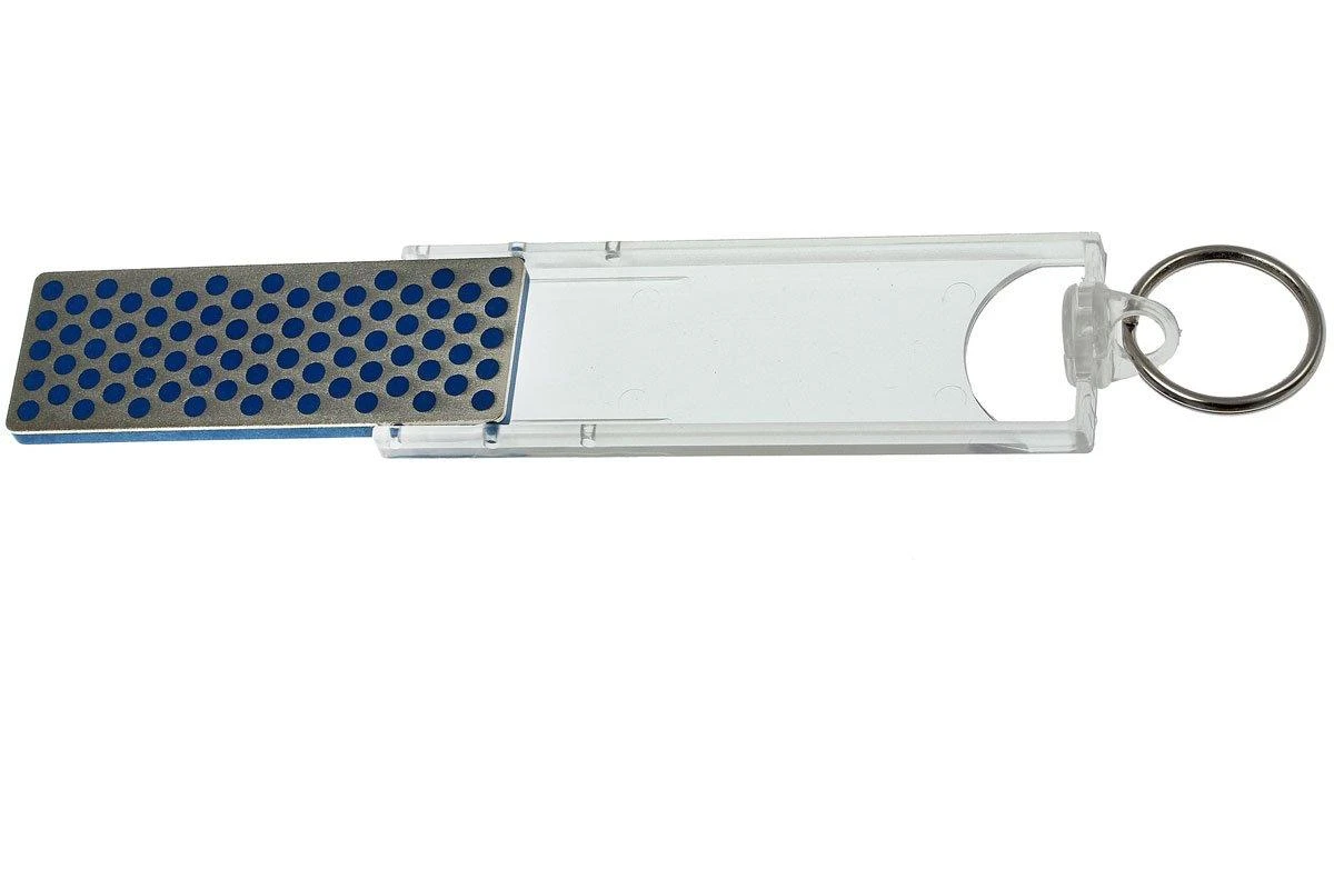 Einfach diesen kompakten Schleifstein mit Diamantschleiffläche am Schlüsselbund befestigen, und Sie haben immer und überall die Möglichkeit, Ihre Messer eben kurz nachzuschärfen. Trotz seiner geringen Größe ist dieser Schleifstein ein echter DMT-Schleifstein mit entsprechender Schleifqualität, der richtig zum Schärfen eingesetzt werden kann.