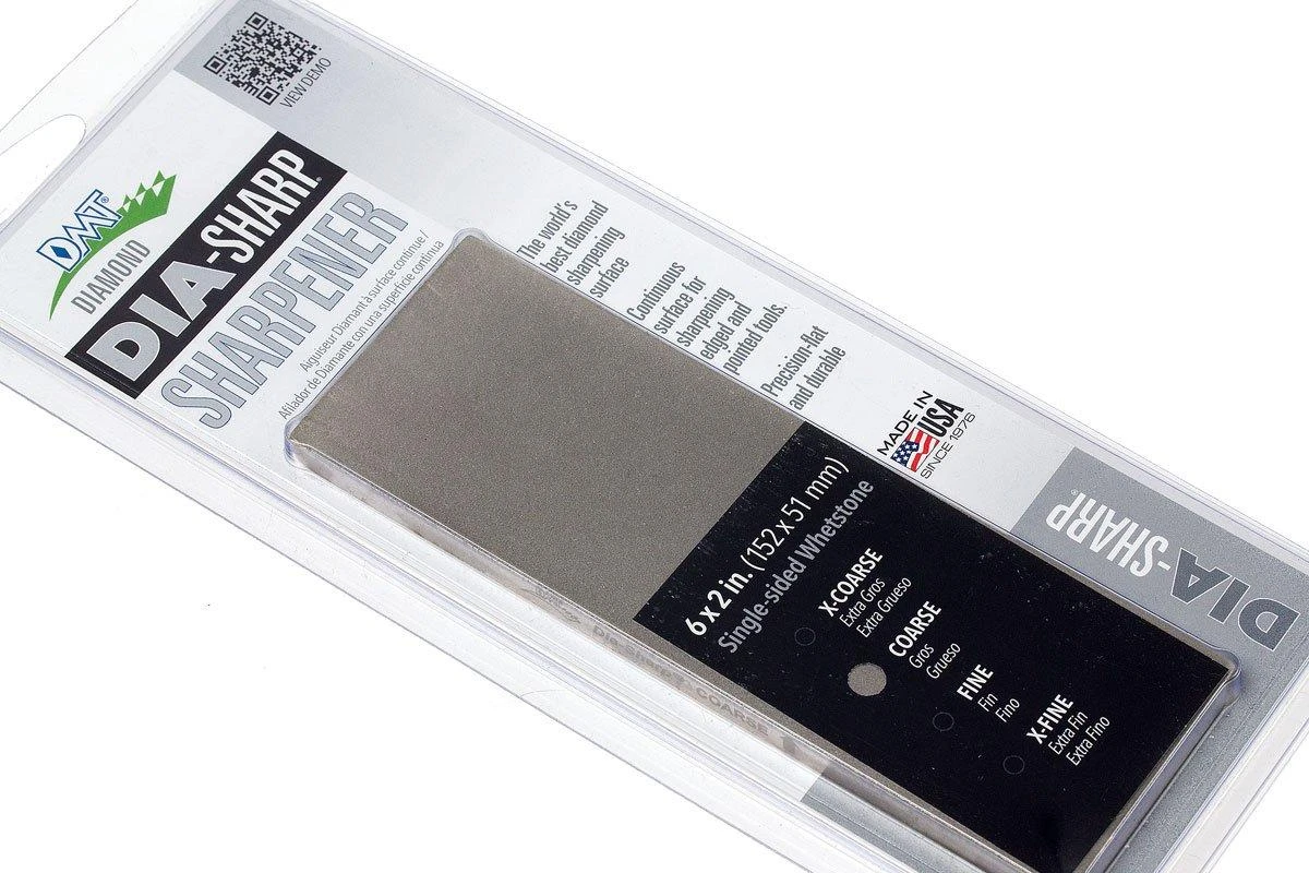Der DMT DiaSharp Bench Stone 6×2 D6C Einseitig, Grob ist ein kompakter Schleifstein. Der grobe Stein schärft eine stumpfe Schneide schnell und bereitet die Schneide für den Feinschliff vor. Diamantschleifsteine schärfen schnell und je nach Körnung auch sehr scharf. Ein großer Vorteil beim Schleifen auf einem Diamantschleifstein ist, dass er nicht geglättet werden muss. Bei diesem DiaSharp Stein ist der schleifende Diamant auf einer dicken Stahlplatte von 6 mm aufgebracht. Dies garantiert die Planheit des Schleifsteins.