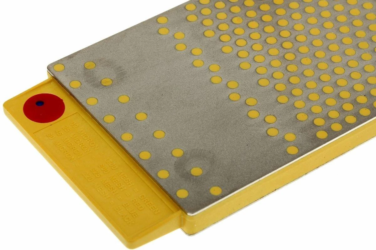Der DMT DuoSharp Plus WM8FC Schleifstein ist ein großer doppelseitiger Diamantschleifstein, der sich ideal zum Schärfen von großen Messern eignet. Ein Teil der Schleiffläche hat das bekannte DMT-Kreismuster und ein kleiner Teil ist komplett geschlossen. Auf diesem Stück können z. B. kleine Meißel oder andere kleine Gegenstände geschärft werden, ohne in den Löchern stecken zu bleiben. Eine Seite des Schleifsteins hat eine grobe Körnung und die andere eine feine. Die Körnung ist an dem blauen und roten Punkt zu erkennen.