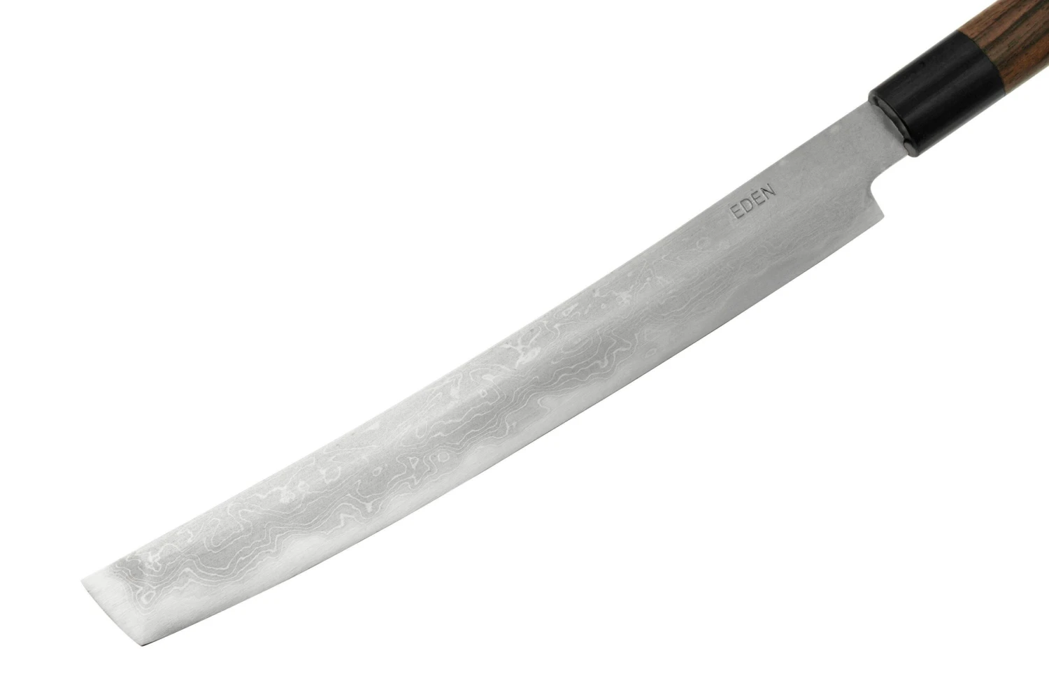 Das Eden Takobiki Ryoba 24 cm ist ein kleines Samurai-Schwert für die Küche. Mit einer Klingenlänge von 24 cm kannst Du mit nur einer Bewegung das dünnste Sashimi schneiden! Das Takobiki ist nicht einfach nur irgendein Messer. Sobald man das Takobiki aus der mitgelieferten Holzscheide zieht, hört man in der Ferne das Dröhnen von hunderten von Taiko-Trommeln. Deine Küche verwandelt sich in einen nebligen Bambuswald, den Dein Takobiki problemlos durchtrennt. Aber der Nebel behindert noch Deine Sicht. Die Taiko-Trommeln hören auf. Du stehst wieder in Deiner Küche. Vor Dir steht das beste Sushi, das Du jemals zubereitet hast.