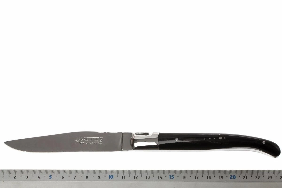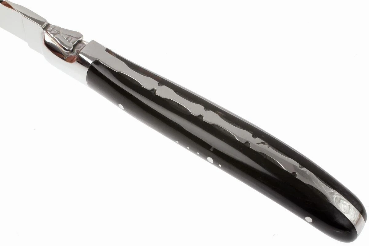 Das Fontenille Pataud Steakmesserset besteht aus sechs Laguiole-Tafelmessern mit einem Griff aus Büffelhorn. Dieses Material ist selten und sehr teuer. Außerdem verwendet Fontenille Pataud nur die Spitzen der Hörner, da diese „voller“ und damit wertvoller sind als der Rest des Horns.