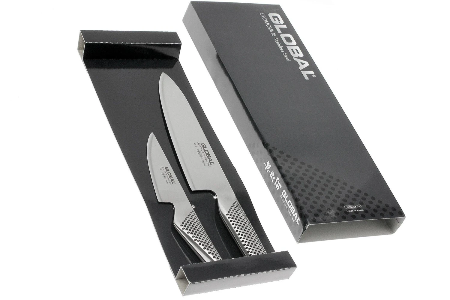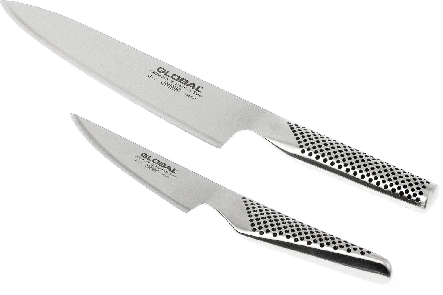 Dieses zweiteilige Global-Messerset besteht aus einem G-2-Kochmesser und einem GS-1 Officemesser. Zwei japanische Messer, aus hochwertigem, rostfreiem Cromova 18-Stahl gefertigt. Sie sind nicht nur sehr scharf, sondern dank des hohen Chromgehalts auch sehr verschleißfest, korrosionsbeständig und leicht zu schleifen.