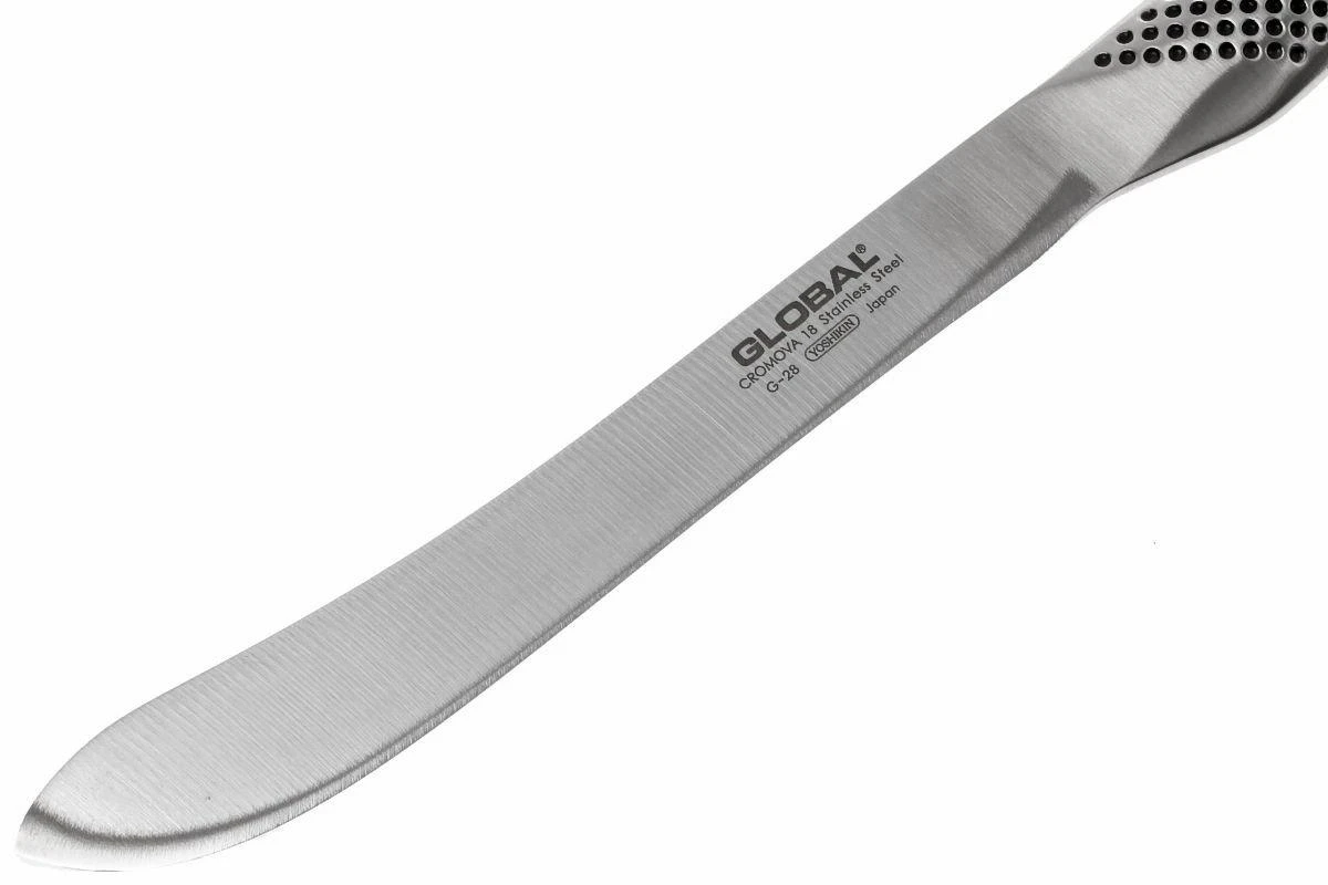 Das Global G28 Fleischermesser ist perfekt für alle häufig vorkommenden Aufgaben. Das Aufschneiden von Fleisch und das Abziehen der Haut sind Aufgaben, bei denen sich das Global G28 wie zu Hause fühlt. Die Klinge ist aus rostfreiem Cromova 18-Stahl gefertigt, was ihr Stabilität und Kraft verleiht.