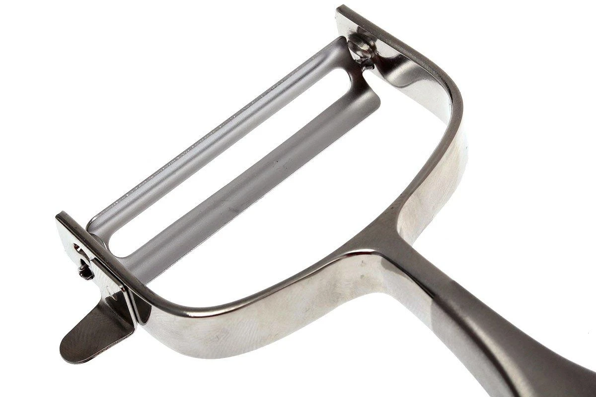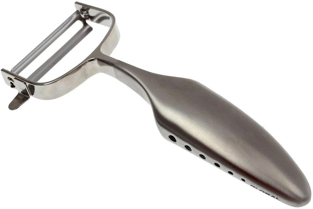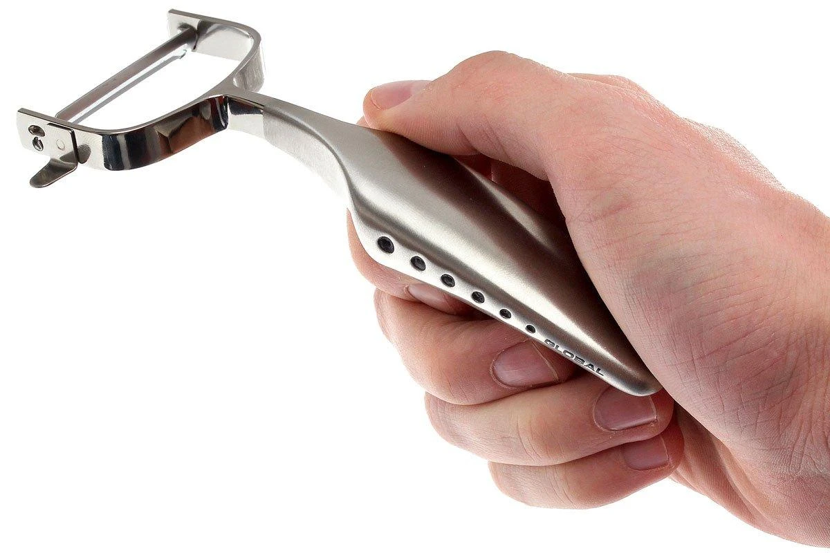 Dieser Sparschäler von Global ist ideal zum dünnen Schälen von Gemüse, Kartoffeln oder Früchten. Der ergonomisch geformte Griff mit dem traditionellen Punktdesign liegt gut und rutschfest in der Hand. Die Klinge lässt, so wie man es von Global gewöhnt ist, nichts an Schärfe zu wünschen übrig. Der Sparschäler hat eine glatte, leicht schwingende Klinge. Zum Entfernen von Verunreinigungen ist seitlich an der Klinge ein kleiner Ausstecher angebracht. Der GS68 Sparschäler ist komplett aus Edelstahl gefertigt.