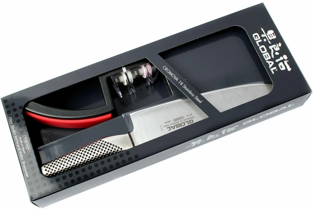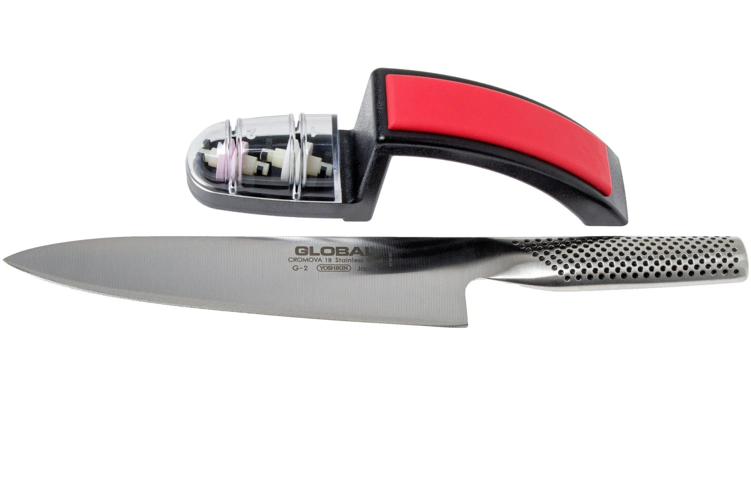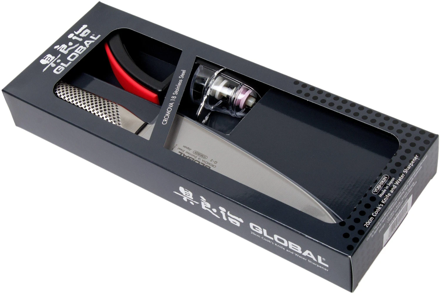 Das Global Set G2 Kochmesser 20 cm und Global Minosharp 220BR ist ein perfektes Paket mit einem Kochmesser und einem Wasserschleifer! Das G2 Kochmesser von 20 Zentimetern kommt bereits sehr scharf aus der Verpackung, aber mit dem Global Minosharp Wasserschleifer hältst Du das Messer wirklich extrem scharf.