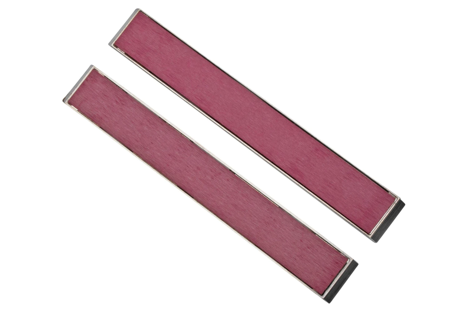 Das KMFS Ruby 3000 Schleifsteinset besteht aus zwei Keramik-Schleifsteinen mit einer Korngröße von 3000. Die Schleifsteine bestehen aus Aluminiumoxid mit einem Zusatz von gemahlenen Rubinsteinen. Der Stein hat eine Korngröße von 3000. Allerdings werden die Rubinsteine während des Schleifens immer feiner und feiner. Das Endergebnis ist deutlich feiner als Korngröße 3000. Der Stein ist extrem hart, wodurch er so gut wie gar nicht abnutzt.
