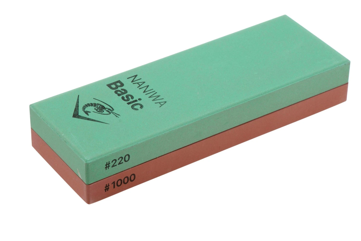 Der Naniwa Basic Stone 502/510 ist ein zweiseitiger Schleifstein vom japanischen Schleifspezialisten Naniwa. Dieser Wasserstein hat sowohl eine grobe Seite mit Korngröße 220 (grün), als auch eine mittelfeine Seite mit Korngröße 1000 (rot). So eignet sich dieser Stein hervorragend, um den Winkel Deines eher stumpfen Messers wiederherzustellen und anschließend die Schneide mit der 1000er-Seite zu schärfen.