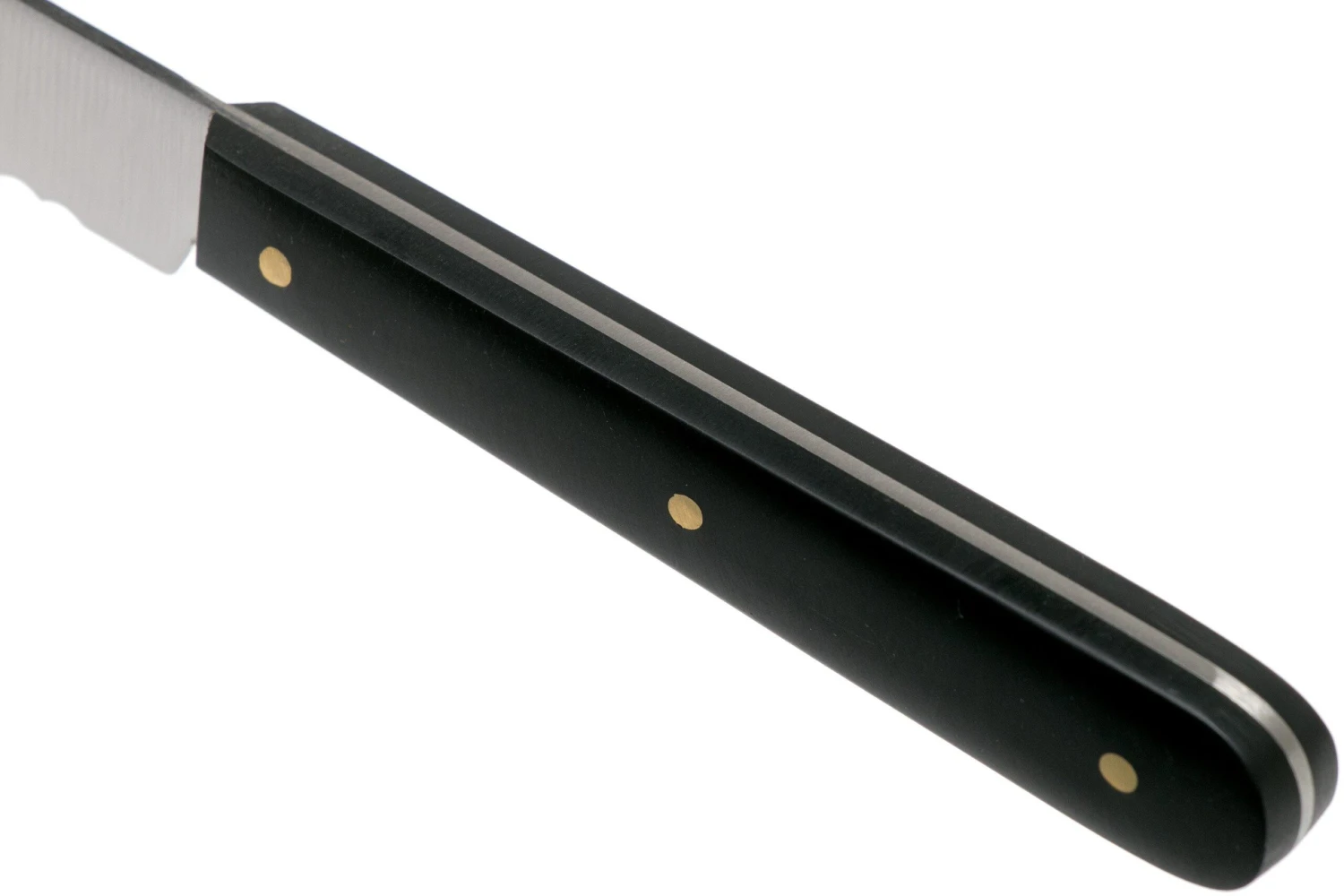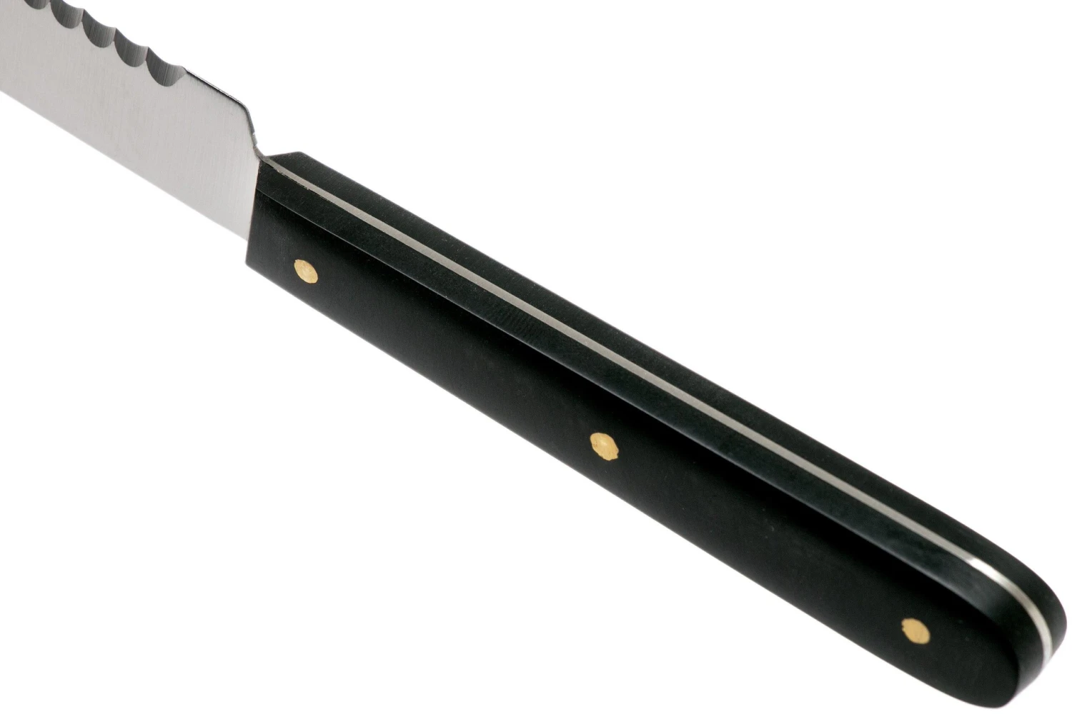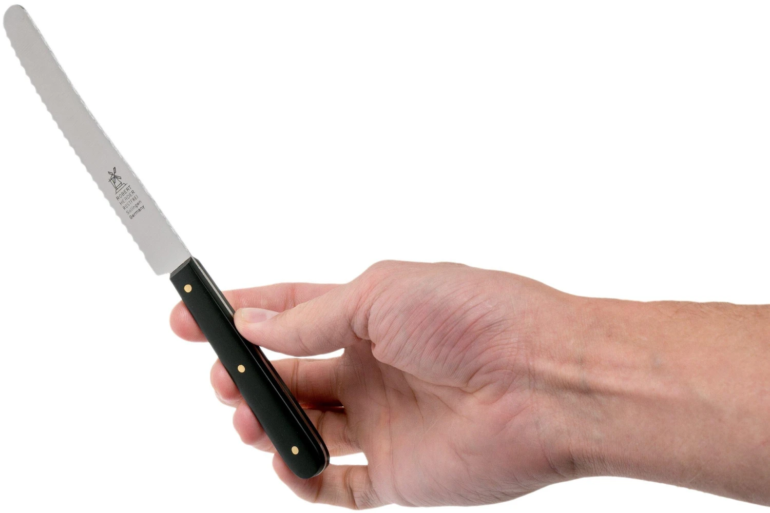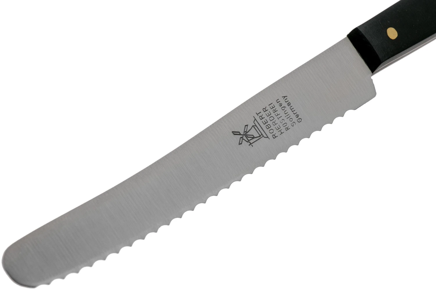 Diese Robert Herder Tafelmesser sind sehr scharf und machen auf dem Tisch eine gute Figur. Es sind tolle Messer, die in Deutschland hergestellt werden. Das Tafelmesser hat eine so genannte französische Klinge mit Wellenschliff. Praktisch zum Schneiden von beispielsweise Käse, Brot und Salami. Aber die abgerundete Spitze ist auch guut geeignet, um zum Beispiel ein Butterbrot zu schmieren!