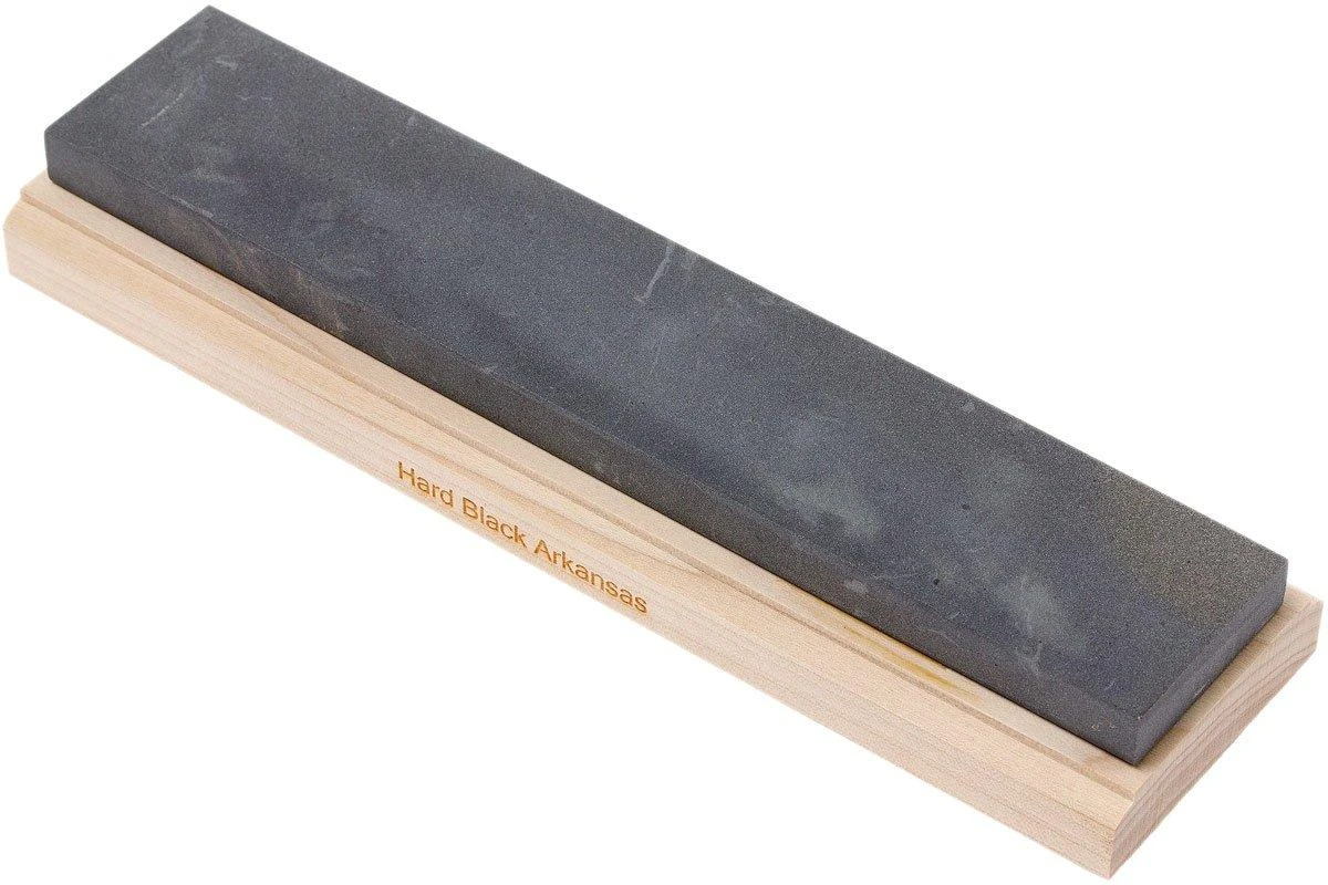 Auf holz montierte Skerper Hard Black Arkansas-Schleifstein. Der Hard Black Arkansas-Schleifstein ist vergleichbar mit einer 2000-3000er Körnung eines synthetischen Wassersteins.