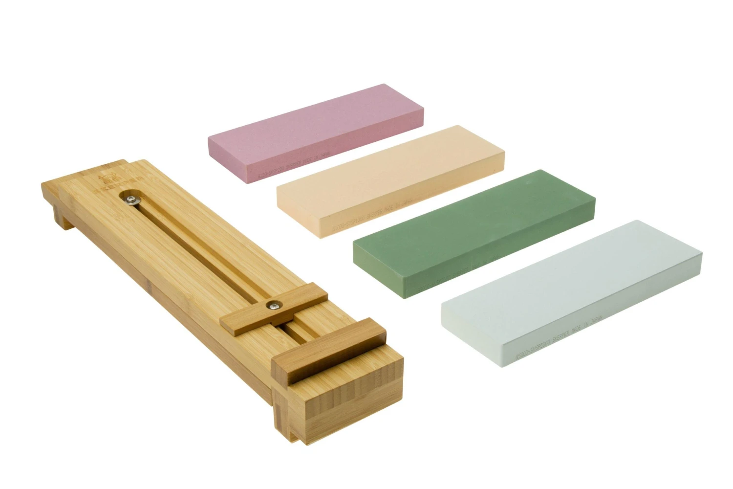 Das Skerper Professional Schleifpaket beinhaltet Schleifsteine mit den Körnungen 220, 1000, 2000, 5000 sowie einen Skerper Sink Bridge Schleifsteinhalter. Damit erhältst Du alles, was Du brauchst, um selbst als (semi-)professioneller Messerschärfer zu arbeiten!