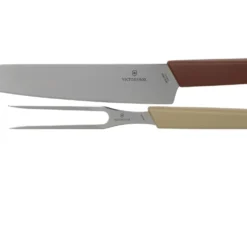 Dieses Victorinox Swiss Modern Set besteht aus einem Victorinox Swiss Modern Fleischgabel und einem Victorinox Swiss Modern Fleischmesser. Dies ist die perfekte Kombination für jeden Koch, der gerne ein gutes Stück Fleisch zubereitet. Mit der Gabel kannst Du das Fleisch umdrehen oder es beim Schneiden festhalten, ohne es mit der Hand anfassen zu müssen. Mit dem scharfen Messer kannst Du das Fleisch problemlos in dicke oder dünne Scheiben zerteilen.