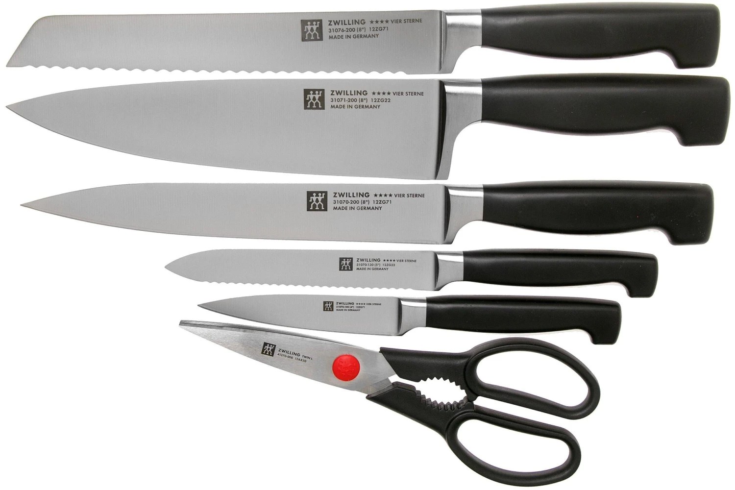 Dieses Zwilling Four Star Messerset enthält einen Messerblock, fünf Küchenmesser und eine Schere. Besonders der SharpBlock Messerblock ist etwas Besonderes: Er ist mit der sogenannten KIS-Technologie ausgestattet. Das bedeutet, dass drei der sechs Schlitze (für die Messer mit glatter Schneide) mit kleinen keramischen Schleifsteinen bestückt sind, die im idealen Schleifwinkel positioniert sind. Jedes Mal, wenn Du ein Messer herausziehst oder es zurück machst, wird Dein Messer geschärft. Die Piktogramme neben den einzelnen Schlitzen sind sehr praktisch. Diese zeigen deutlich, welches Messer in welchen Schlitz passt. So kann nichts schiefgehen.